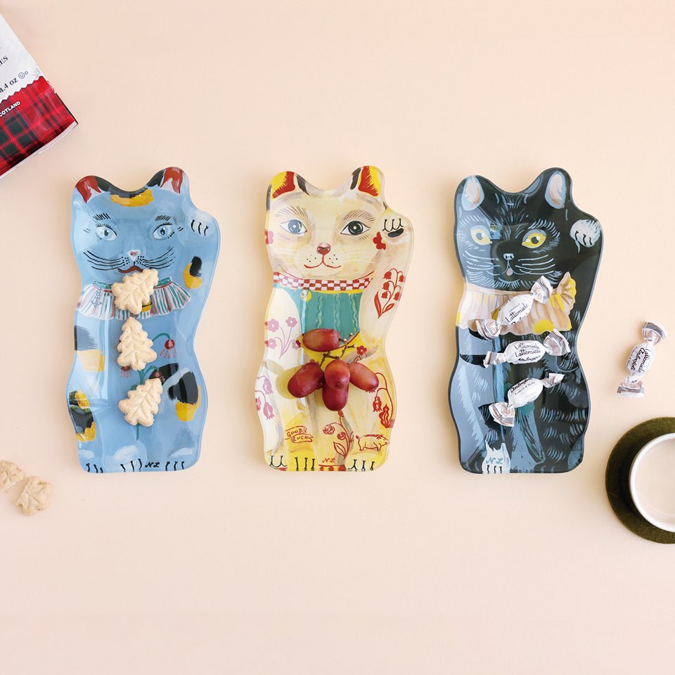ナタリー・レテの描く動物シリーズで、グッと人気を伸ばしている招き猫が、そのままガラスプレートになって登場です。